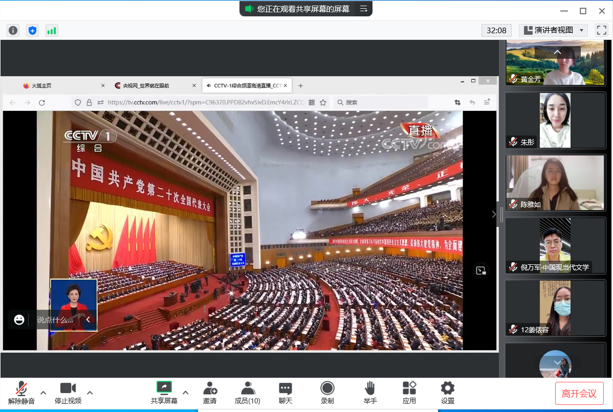 10月16日上午,中国共产党第二十次全国代表大会在人民大会堂开幕,中文系师生党员以各种形式收看了开幕式盛况,并认真学习总书记向大会作的报告。这一天,也是华东师范大学建校71周年的校庆日,也是中文系建系71周年的系庆日,师生党员以这样的一种形式为我们的校庆、系庆献上了一份与众不同,特别有意义的礼物。