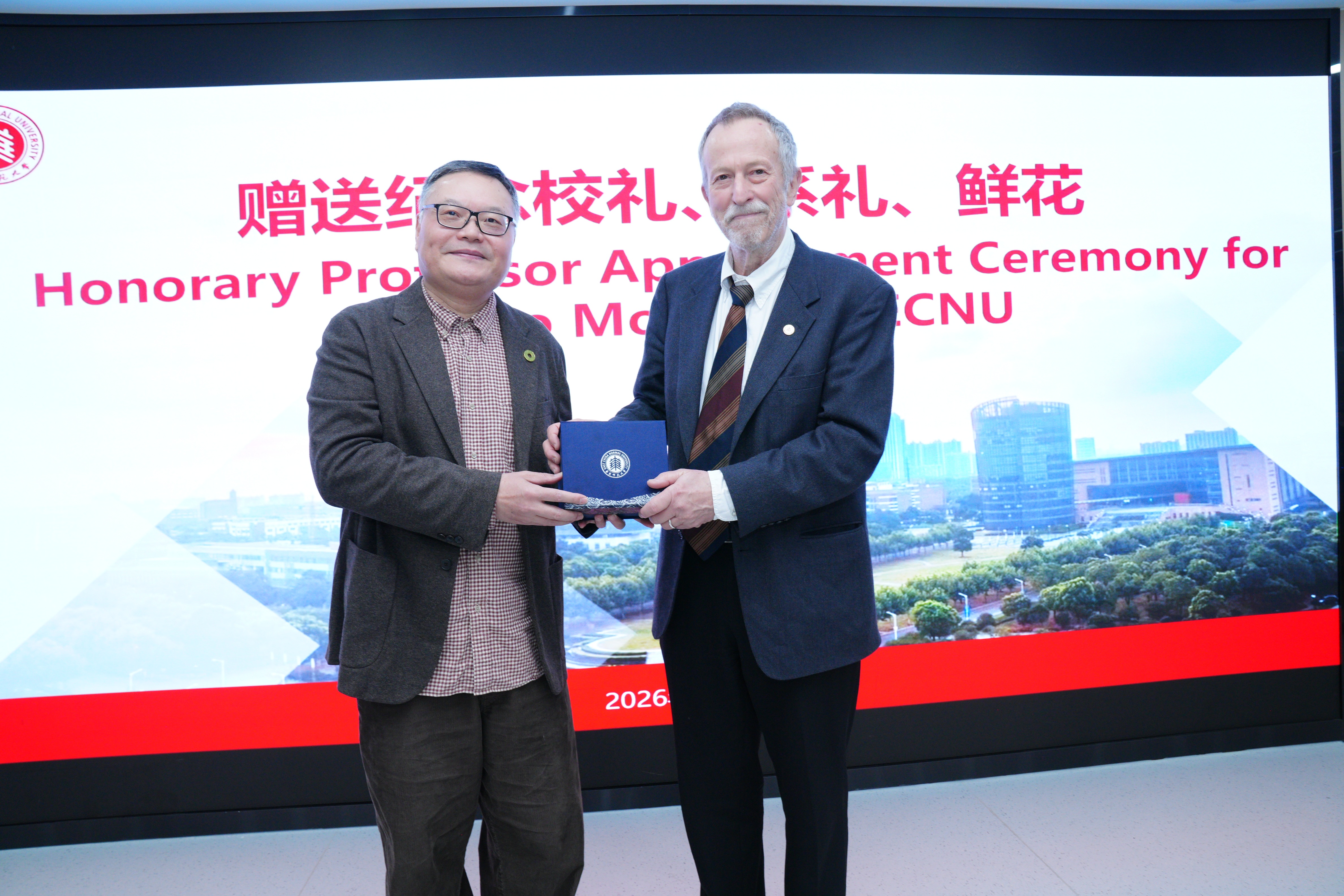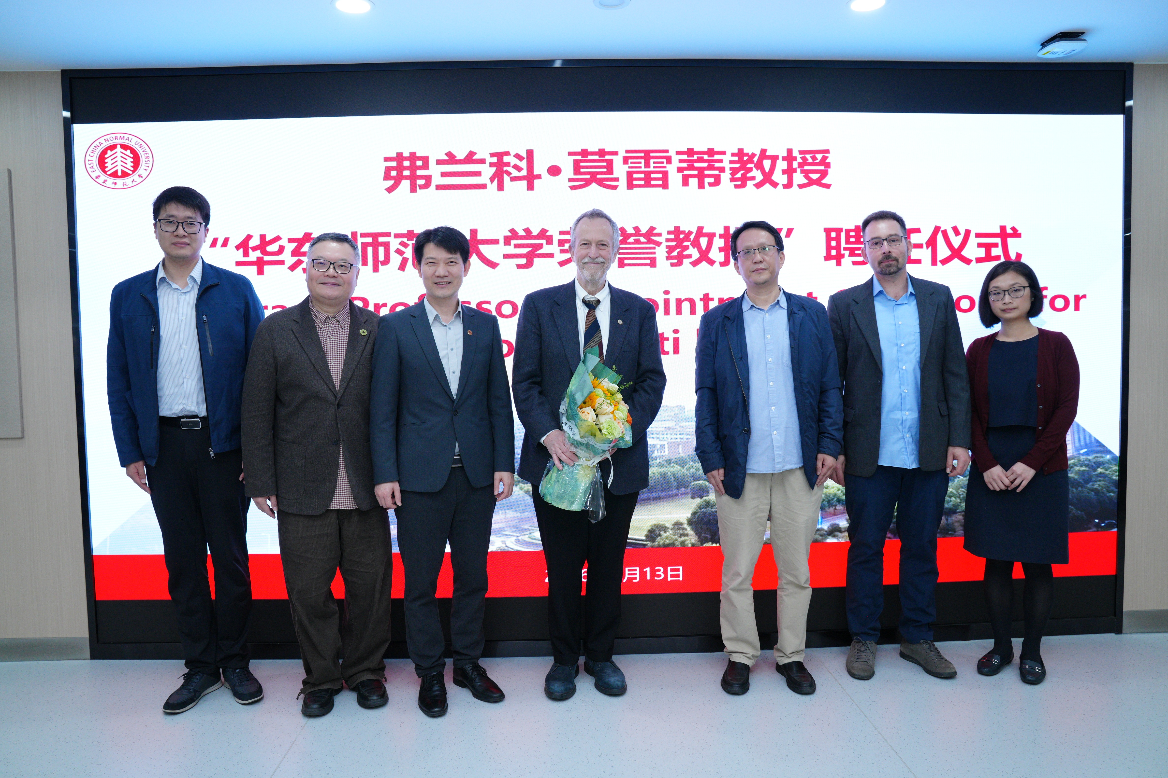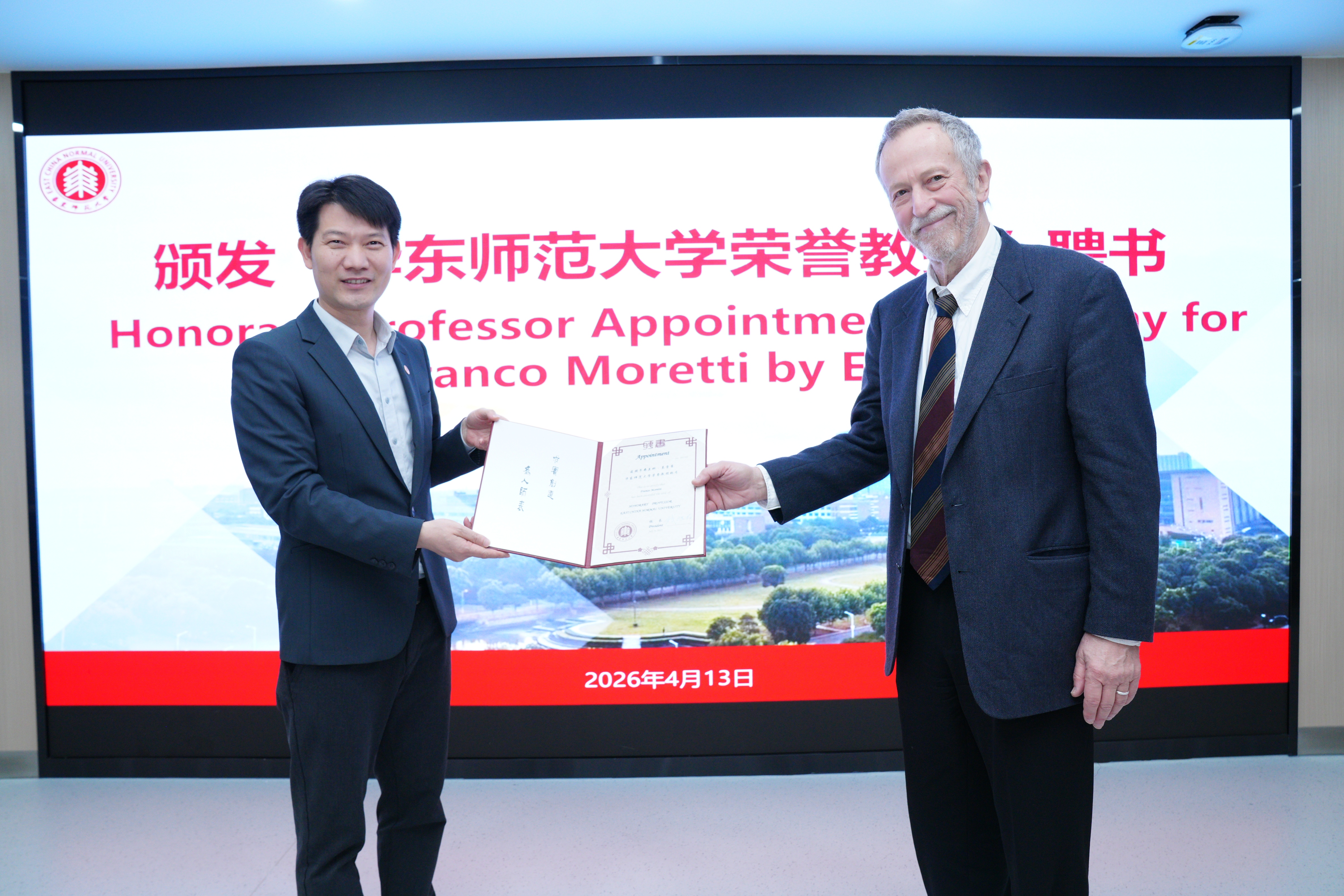 2026年4月13日,国际著名文学理论家、斯坦福大学教授弗兰科·莫雷蒂(Franco Moretti)受聘华东师范大学荣誉教授仪式在闵行校区隆重举行。副校长吴健、国际合作与交流处业务主管孟雨、中文系系主任罗岗及师生代表共同出席见证。聘任仪式由中文系副系主任刘成国主持。