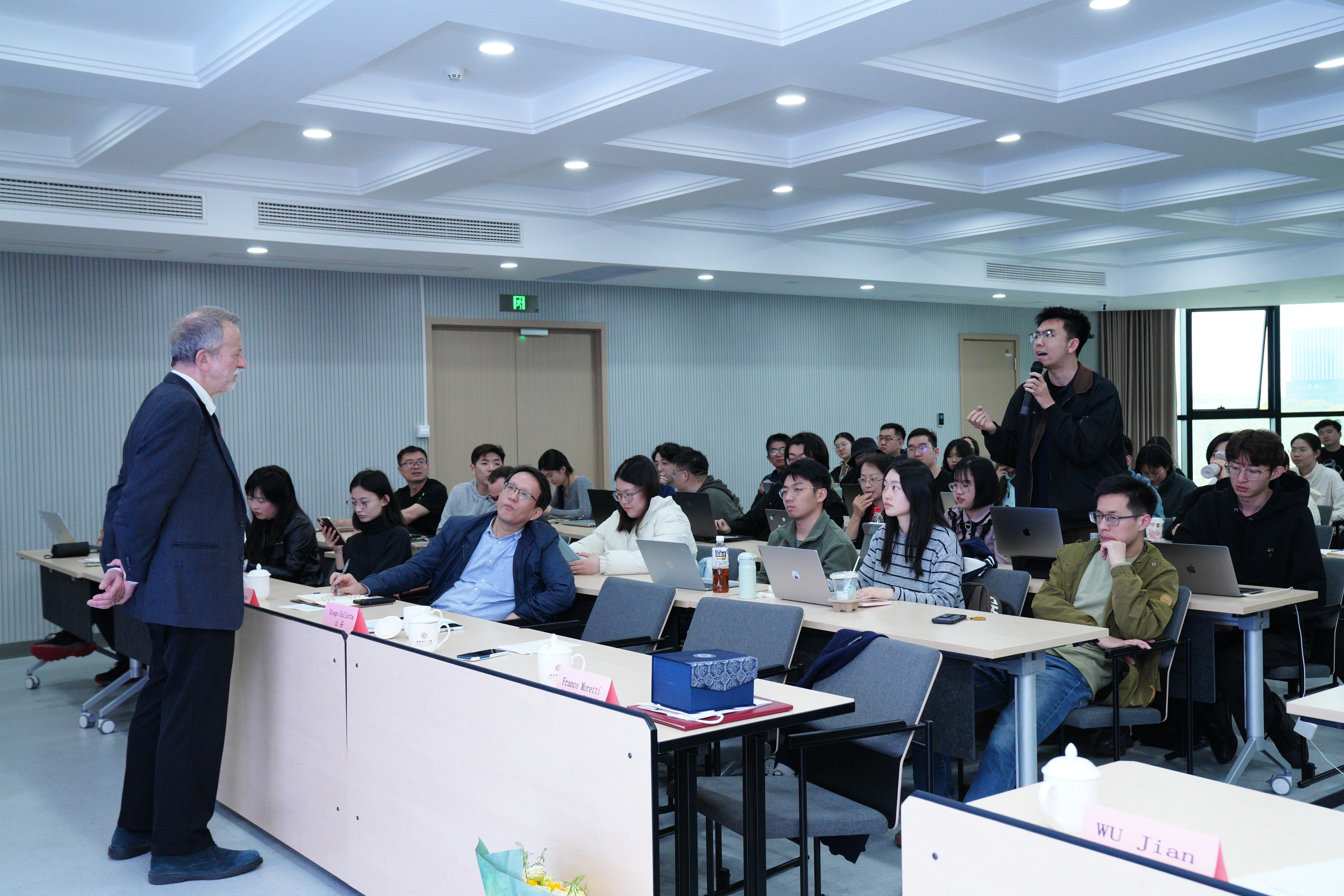 讲座视野宏阔、论证缜密,现场反响热烈。在交流环节,与会师生围绕形式的规范性力量、文学形式的全球传播等问题展开讨论,莫雷蒂教授结合自身研究逐一回应。讲座在活跃的学术对话中圆满结束。