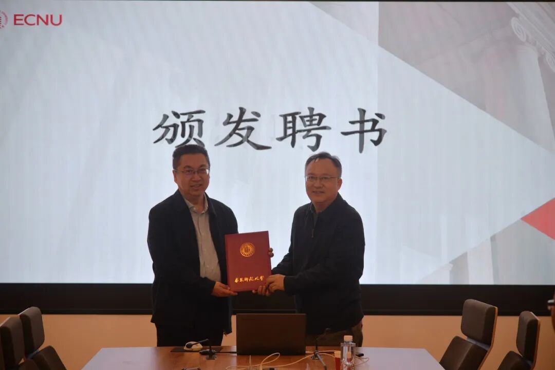 随后举行聘书颁发仪式,副校长雷启立教授为李岩先生颁发华东师范大学兼职特聘教授聘书。